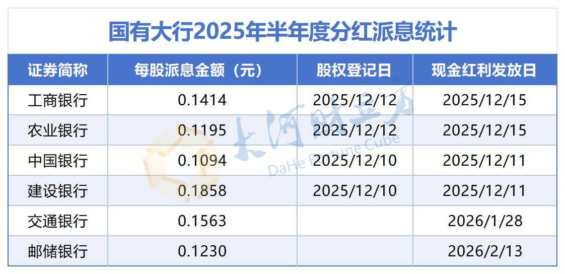 【大河财立方 记者 孙凯杰】12月8日,工商银行、农业银行发布2025年半年度分成派息执行公告,暗示将于12月15日披发中期现款红利。此前,中国银行、建立银行已于12月5日发布半年度分成公告。
